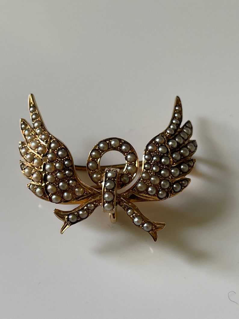 Natural saltwater seed pearl and yellow gold winged brooch late Victorian early Edwardian with a hook suitable for hanging a pendant such as a pearl or a heart. Set in high carat gold and beautifully detailed.